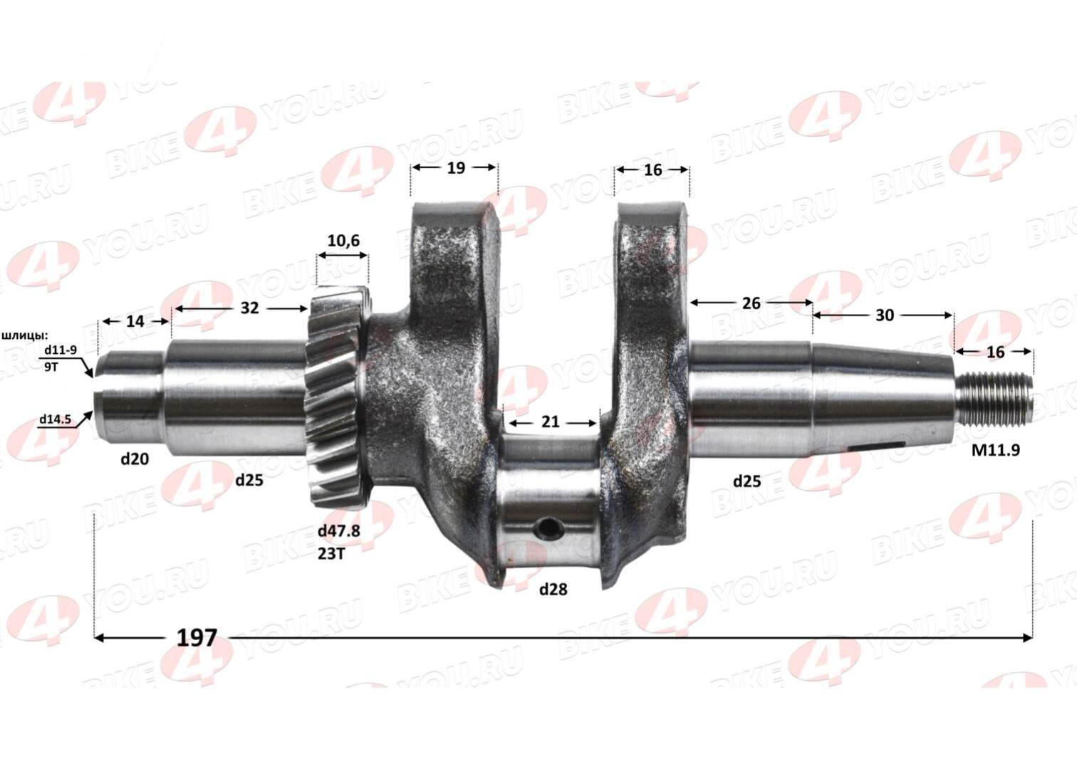 Шейки и опоры: Коленвал имеет две основные шейки диаметром d25 мм (основная) и d20 мм (вспомогательная), с длинами посадочных поверхностей 32 мм и 14 мм соответственно. Коренная шейка (d25 мм) предназначена для установки в блок цилиндров с подшипниками скольжения или роликовыми подшипниками, обеспечивая осевое центрирование. Шатунная шейка смещена относительно оси на радиус кривошипа 21 мм, с диаметром d28 мм и шириной 26 мм, что позволяет подключение шатуна стандартного типа.